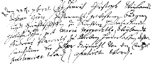 „Den 23ten 7bris [1684]: Ist Henrich Christoph, Weÿlandt Johann Geörg Echternachs, geweßenen Bürgern undt Gerichtsschöffen zu Kirchberg hinderlassner ehelicher Sohn, mit Maria Margaretha, Weÿlandt Andreas Plawerts zu Biebern hinderlassenen Dochter (nachdem sie Zuvor dreÿmahl von der Cantzel proclamiret worden) copuliret worden.”