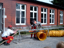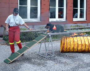 Und hier zeige ich, was ich gelernt habe. Eigentlich ist es gar nicht so schlimm. Wenn dieser merkwürdige Geruch nicht wäre, würde ich mich hier natürlich viel lieber hinlegen. Aber Meike meint, das gehört zu einem richtigen Rettungshund dazu. Schließlich könnte es ja mal sein, dass ich verschüttete Menschen in einer Ruine suchen muss, und da kann es schon mal vorkommen, dass es noch rauchende Trümmerreste gibt. Wenn ich da zu ängstlich wäre, würde ich die Verletzten vielleicht nicht rechtzeitig finden.