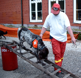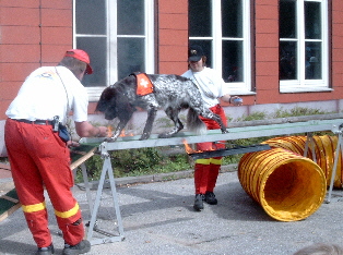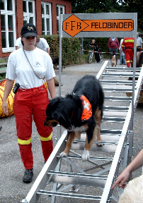 Den kennst Du schon: Das ist Wolfi,er geht gerade über die Leiterbrücke. Auch das ist eine schwierige Übung: Es ist für uns nicht so leicht, die Hinterbeine auf die richtigen Stufen zu stellen, weil wir die ja nicht sehen können. Das müssen wir immer wieder üben, damit wir ein Gefühl dafür bekommen, die hinteren Füße richtig aufzusetzen. Du siehst hier einen besonders schwierigen Teil der Leiterbrücke: Die Stufen sind nach vorne geneigt, und da rutschen wir mit unseren Pfoten leicht ab! Thomas redet Wolfi gut zu, und er schafft auch die letzten Stufen noch ohne hinunterzufallen.