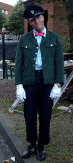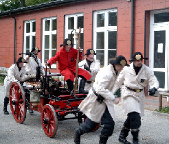Andreas ist ein Feuerwehrmann. Ich habe mich ein bisschen gewundert über die merkwürdige Uniform, normalerweise sieht er eigentlich ganz anders aus. Aber das hat wohl etwas mit dem historischen Krimi zu tun, den sie hier aufgeführt haben. Ein Brandstifter hat im Rathaus gezündelt, und die „Wittkittels”, die Feuerwehrleute aus dem 19. Jahrhundert, kamen mit einem uralten Spritzenwagen und haben schnell gelöscht. Den Brandstifter hat dann der Schutzmann gefunden. Das ist eigentlich nicht in Ordnung, ich hätte den doch auch gerne gesucht! Und ich wäre bestimmt viel schneller gewesen!