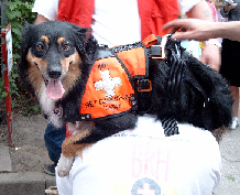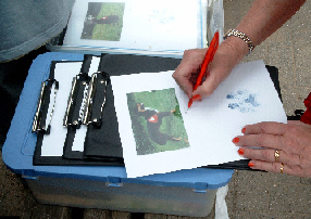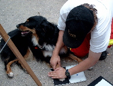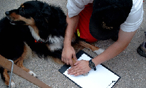 Nun hat die Autogrammstunde begonnen: Die Besucher können von jedem Hund ein Autogramm bekommen. Meike drückt meine Pfote auf das Stempelkissen und anschließend auf einen Papierbogen. Das mag ich eigentlich nicht so gerne, denn ich habe dafür noch niemals etwas zur Belohnung bekommen! Na ja, so schlimm ist das eigentlich nicht, denn die Menschen bezahlen ja für die Autogramme, und so kommt wenigstens ein bisschen Geld in die Staffelkasse. Oben auf dem Papierbogen wird ein Foto befestigt, der Name des Hundes wird aufgeschrieben, und schon ist das Autogramm fertig.