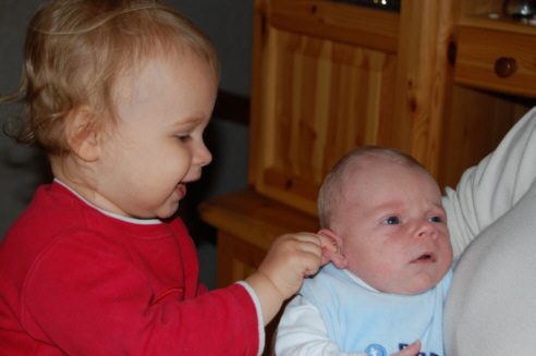 Auch seine Cousine Jantje hat ihn schon begutachtet. Leider ist er ziemlich langweilig: Man kann noch nicht mit ihm spielen, er schläft die ganze Zeit...