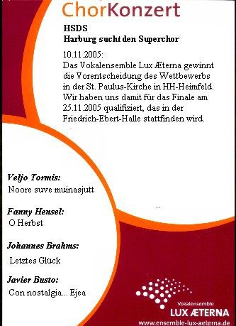 Wir haben es geschafft! Bei der Endausscheidung am 25.11.2005 erreichte Lux Æterna den 1. Platz.