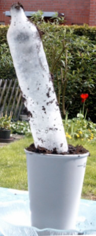 Was hat es mit diesem Blumentopf auf sich? Es handelt sich um den besonders schnell wachsenden „Pariser Gummibaum”. Wie so oft kam es natürlich auch hier zum Vorführeffekt: Nachdem Meike die Blumenerde ausgiebig gewässert hatte, dauerte es doch einige Minuten, bis sich ein erster Erfolg zeigte. Aber dann kam doch ein ansehnliches Exemplar zum Vorschein.