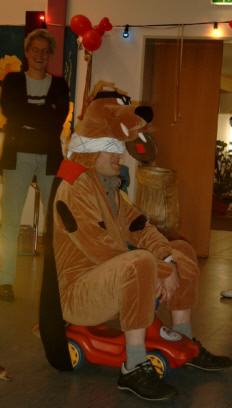 Hier stellen wir zwei der Aufgaben vor: Poldi muss im Hundekostüm mit verbundenen Augen auf dem Einsatzfahrzeug der Hundestaffel einen Slalom meistern. Die alkoholhaltigen Hindernisse durfte er sich anschließend einverleiben. Trotz der angesichts der fortgeschrittenen Zeit und der damit promillebedingt widersprüchlichen Zurufe ist es ihm gelungen, fehlerfrei das Ziel zu erreichen.