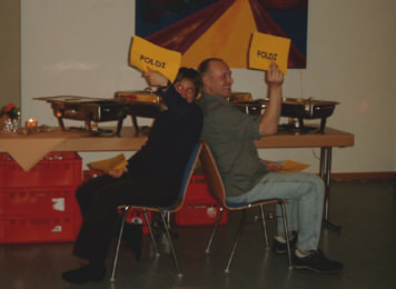 Eine weitere Aufgabe bestand darin, die Fragen zu den Lebensgewohnheiten möglichst übereinstimmend zu beantworten. Einige Fragen, wie z. B. nach dem größeren Morgenmuffel, wurden ziemlich zögerlich beantwortet – andere, wie hier auf dem Bild, sehr spontan: „Wer von Euch ergreift beim Sex die Initiative?”