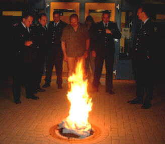 Wir haben es ja schon immer geahnt: Die Feuerwehrleute betätigen sich auch als Brandstifter. Hier wurde Poldi seiner Hose beraubt, und er musste zusehen, wie sie in Flammen aufging. Gänsehaut? Nein, dagegen gab es einen kräftigen Schluck!