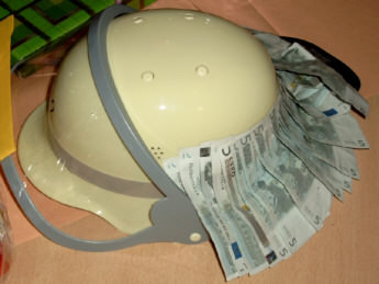 Geschenke für das Brautpaar gab es natürlich auch. Hier ein Feuerwehrhelm mit (allerdings nicht ganz vorschriftsmäßigem) Nackenschutz und ein Herz aus Süßigkeiten mit dem Logo der Rettungshundestaffel Harburg.